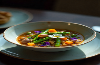 This dish combines soup and salad! It features green lentils, carrots, celery, onions, and a light broth. It is filling but feels light thanks to the healthy plant protein and fiber and the low fat content. It is also gluten-free and vegetarian. This dish meets most allergy requirements, assuming no modifications are made. This soup is a healthy version of the light English dish, which is appropriate for a cozy meal.