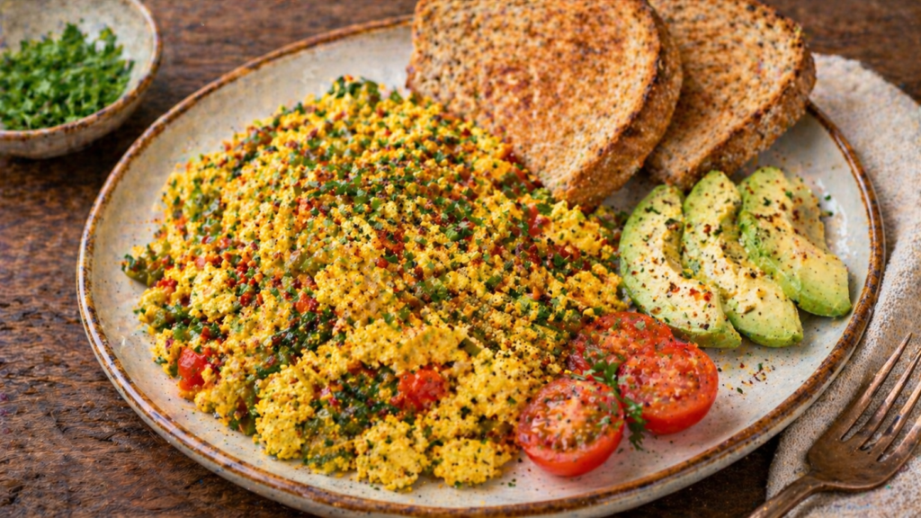 Tofu scramble: a tasty, all-around breakfast that gives you the taste of scrambled egg. It‘s a good option for vegetarians looking for more than a sole diet