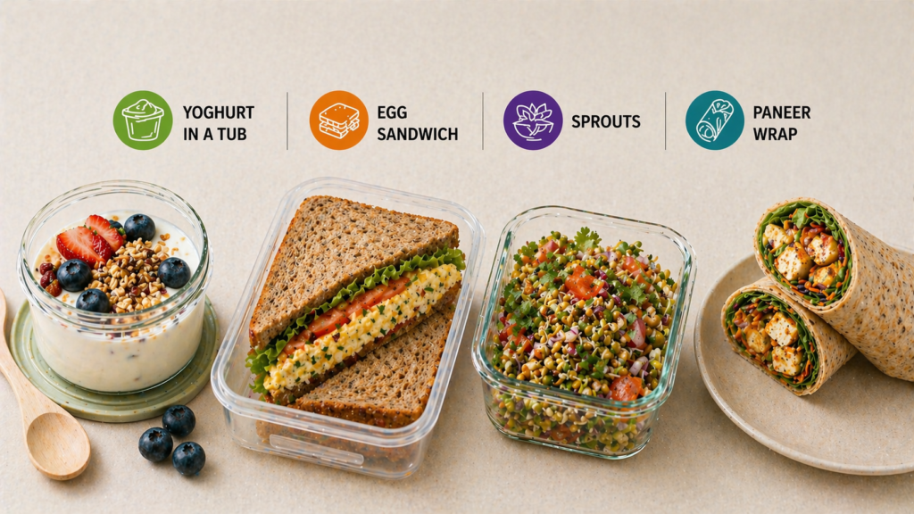 Opt for fast, portable lunches such as yoghurt in a tub, an egg sandwich, some sprouts or a wrap with paneer in it. This will save time and prevent snacking
