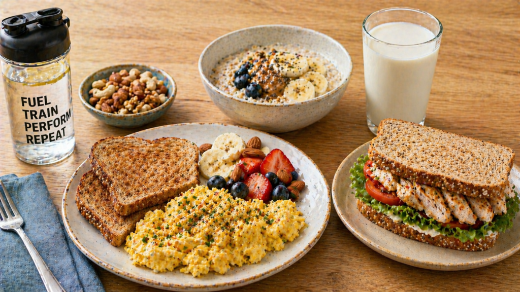 - Carbohydrates: roti, toast, oats or fruit for energy
