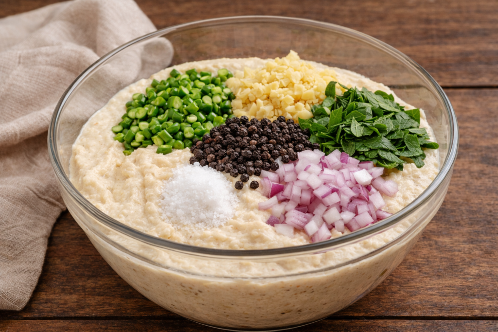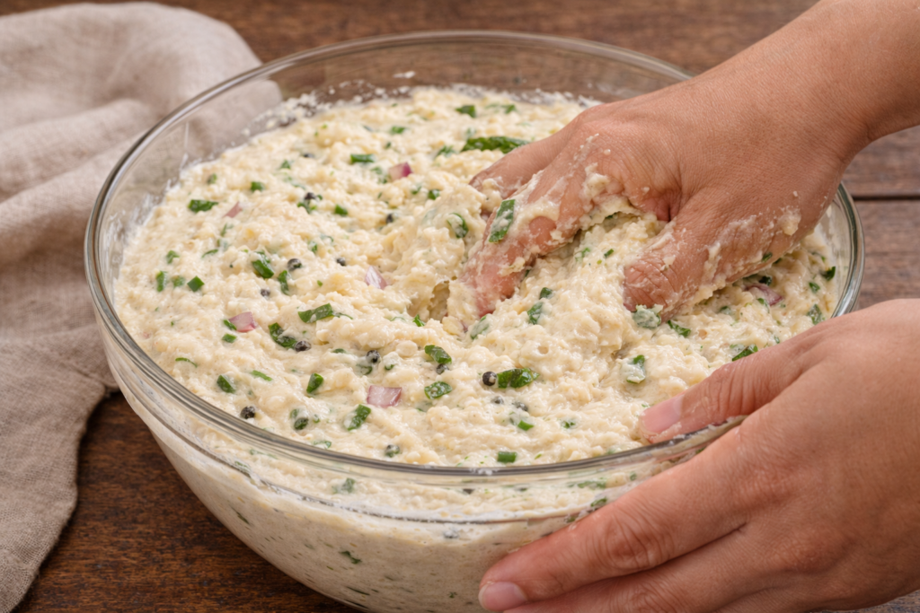 You should mix the batter using your hands for several minutes. The process introduces air into the vada batter, which results in a light and fluffy texture