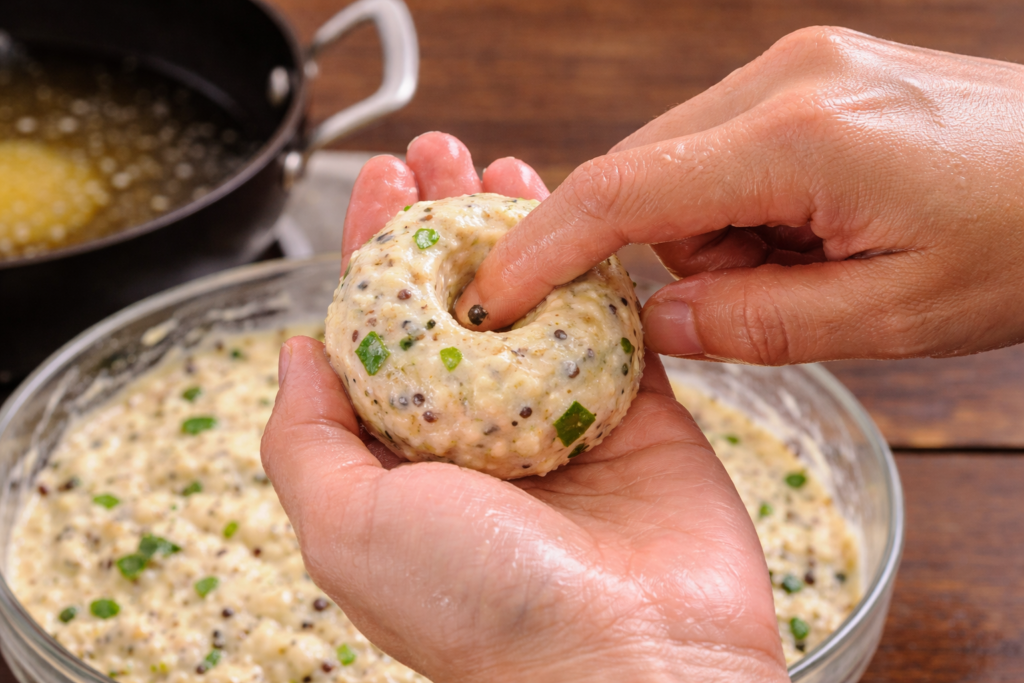 Wet your hands with water. Take a small portion of batter, shape it into a ball, and gently make a hole in the centre to form the traditional vada shape