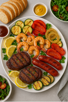 Barbeque items can be made from anything, like vegetables, seafood, tofu, paneer, meat, etc. But today let’s focus on the basic and popular platter that includes beef steak, sausages, prawns, and veggies