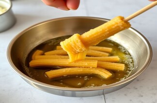 Note: Temperature regulation is prime in frying churros properly. The oil’s temperature should not exceed 195°C. If the oil’s temperature exceeds the required temperature, turn off the flame or add raw oil to the pan.
