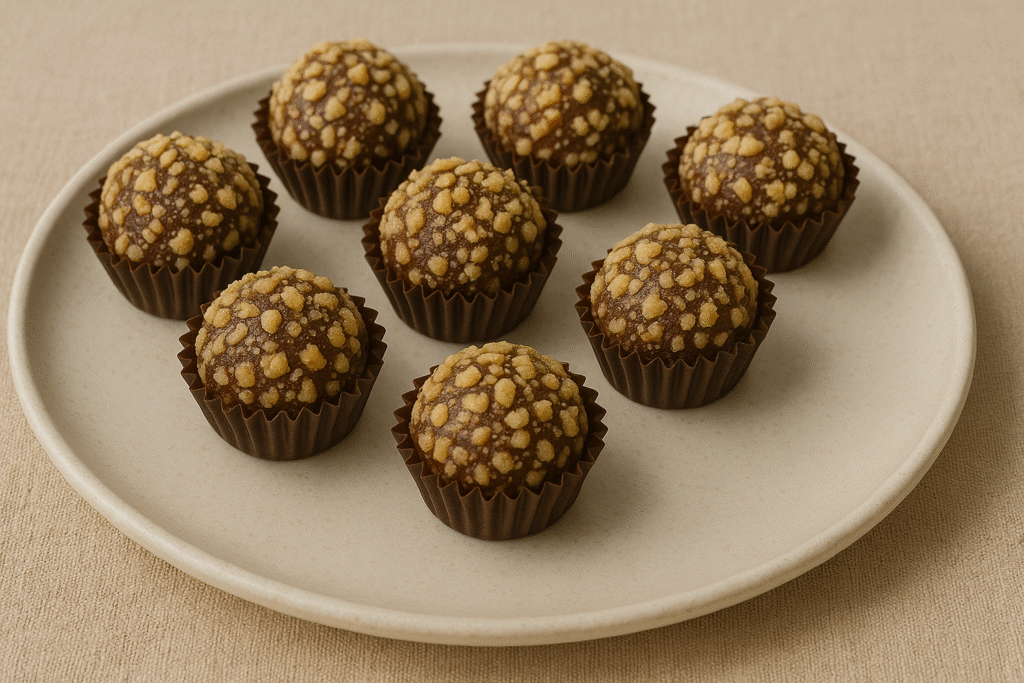 Step 5: Roll each ball in shredded coconut, sesame seeds, or finely chopped pistachios. Place them in mini paper cups or directly onto a serving plate.