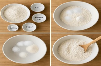 - Add flour, baking powder, sugar, and kosher salt in a large bowl and mix it to make a homemade base batter.