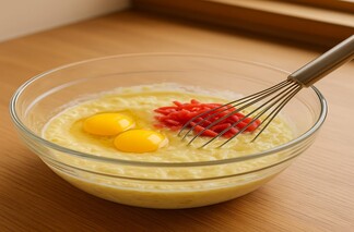 - When ready, remove the batter from the fridge, add beaten eggs, and beni shoga/kizami beni shoga. Whisk until it softens and becomes fluffy.