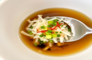 • Mix the dashi and ponzu dip in a small bowl and add the udon to it.